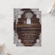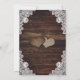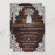 Invitación rústica para bodas de bebé en un país con flores para el aliento dentro de un frasco de albañilería contra un fondo rústico de madera decorado con encaje floral blanco y luces de cuerda. Personaliza fácilmente la invitación de bodas con el aliento de este romántico bebé para tu país rústico, o fiesta de bodas de granero.