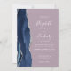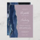 El borde izquierdo de esta elegante y moderna invitación a la boda incluye una barra acuática azul marino bordeada por un falso purpurina plateado. El texto del personalizable combina escritura a mano, copperplate y tipografías cursivas en blanco sobre un fondo malva morado. El reverso presenta un diseño de ágata color azul marino y plata.