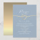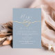 Sencilla, moderna, minimalista invitación de boda micro azul polvo con corazón de cuerda dorada elegante. Invitación de boda única perfecta para minimonio.