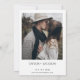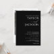 Invitación a la boda de la caligrafía minimalista blanca y negra Cursiva Invitación a la boda Simple, moderna y minimalista en estilo, invitación a la boda de color negro con una moderna caligrafía cursiva entre los nombres de las parejas. En la parte trasera de la invitación hay una fotografía de la pareja y algunos detalles más.
