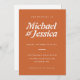 Parte de una suite boda. Una minimalista invitación a una boda naranja de terracota con un diseño tipográfico y una fuente serif inspirada en Art Nouveau que es perfecta para la novia otoño o otoño. La parte posterior de la invitación presenta un diseño monograma sencillo opcional. Personalice fácilmente reemplazando cada información. ¡Elige la tuya.