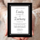 Este sencillo, clásico y minimalista diseño presenta los nombres de la novia y del novio en un moderno tipo de letra para mostrar y el texto restante en negro sobre un rectángulo blanco enmarcado por un borde doble negro. El reverso es negro sólido.