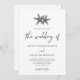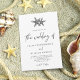 Esta moderna y mínima invitación a una boda en la playa tiene un fondo blanco con un texto gris oscuro, dos estrellas en la parte superior y una caligrafía de escritura a mano a la moda.