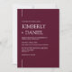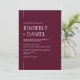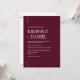 Esta invitación presenta un estilo minimalista moderno con una tipografía serif limpia y sencilla en bloque con fondo de color burdeos. La sencillez de este diseño le da un toque de elegancia a su boda. Funciona bien con muchos temas bodas y sin duda una gran adición a su boda. Simplemente personalizar los nombres y la redacción en unos pocos pasos fáciles y personaliza la tarjeta de invitación con la foto de la pareja feliz y reemplaza el código QR con el tuyo en la parte posterior de la invitación para darle un agradable toque personal. Si necesita cambiar el color, puede personalizar la tarjeta de invitación. Puede personalizar y personalizar la invitación para que se ajuste a sus necesidades de eventos de boda y simplemente haga clic en el personalizar de la invitación. Puede personalizar fácilmente esta invitación con su propio texto y compartirla con sus invitados digitalmente, ya sea a través de texto, correo electrónico o medios sociales. Si lo prefiere, también puede enviar una versión impresa por correo a sus huéspedes. O, puede hacer ambas cosas: enviar una versión digital y hacer un seguimiento con una copia impresa para un toque personal.