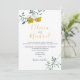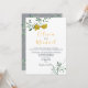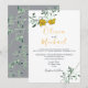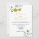 Invitación simple y moderna de boda minimoni floral amarilla, con una combinación chic de vegetación y color gris de moda. Invitación perfecta para una ceremonia de boda íntima y única.