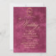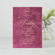 Elegante y elegante fucsia y moderna invitación de boda dorada con un elegante tipo de letra manuscrito con rizos y un monograma de la novia y el novio. Una invitación elegante, sencilla y moderna.