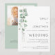 Boda moderna con código QR y foto de Eucalipto. Un diseño botánico moderno, con tu foto favorita en el reverso. Agrega tu código QR a tu sitio web de boda en el reverso, lo que hace que sea una opción conveniente para que tus invitados respondan y vean todos los detalles sin necesidad de tarjetas de RSVP y detalles por separado. Tipografía contemporánea y simplista que puedes personalizar fácilmente. Una elegante rama de hojas de eucalipto en acuarela recorre el lado izquierdo.