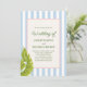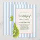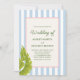 ¡Celebre su día especial con un ambiente tropical retro divertido! Esta invitación de boda cuenta con un fondo a rayas azul suave, hojas de palma y un marco bordeado con cuerda con texto verde. Perfecto para parejas que aman la elegancia caprichosa con un toque de estilo isleño.