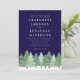 Invitación de Boda de Bosque de Pino Perenne Invernal con Código QR en azul marino y blanco Escena de nieve con árboles de abeto pintados al agua sobre fondo burgundy