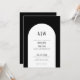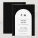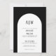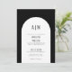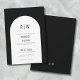 Invitación de boda negro y blanco con monograma de arco simple moderno. Una invitación de boda minimalista con un arco muy simple y fuentes elegantes y sencillas. Un monograma en la parte superior y en la parte posterior para las iniciales de la pareja. Puedes personalizar esta invitación a cualquier color que desees. Hay un segundo 'arco' allí si deseas agregar una línea de acento al arco. Simplemente use los elementos 'óvalo' y 'cuadrado' en la parte inferior de la lista para cambiar esos colores.