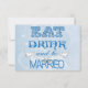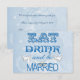Palomas con anillos de boda sobre fondo azul pastel suave para RSVP.