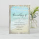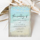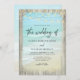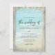 Esta invitación de boda de playa con guión moderno presenta una escena costera con olas del océano chocando contra la orilla, enmarcada con madera gris rústica a la deriva, y decorada en la parte superior con luces de cuerda. Estas invitaciones de boda son perfectas para bodas de destino, así como para cualquier boda con tema de playa y costa.