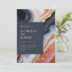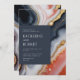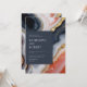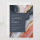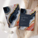 Invitación de boda contemporánea con un cuadrado azul oscuro en el que toda tu información está elegantemente escrita sobre un fondo abstracto de mármol agate. Los detalles del ágate están en tonos naranja y azul con acentos dorados. Visita nuestra tienda para ver más artículos de esta colección de bodas.