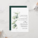 Plantilla de Invitación a guión de ducha de novia Eucalyptus Greenery que puede editar fácilmente para su boda y que es perfecta para una boda elegante de moda. Con follaje eucalipto y tipografía moderna sobre fondo blanco. En el reverso hay un fondo verde esmeralda y liso con un toque boho