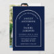 Invitación a la boda azul de la Marina Boho Arch, moderna y de diseño. Foto de vuelta