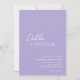 Moderno lavanda morada todo en una invitación de boda con un diseño simple y mínimo con el nombre de la novia en un guión elegante y el nombre del novio en una fuente contemporánea sans serif. Debajo, en la esquina inferior derecha, están los detalles de los eventos en un diseño minimalista. La parte posterior tiene sus detalles adicionales y el código QR, por lo que puede omitir la tarjeta de gabinete y la tarjeta RSVP.