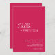 Invitación a una boda moderna de color rosa Viva Magenta, con un diseño sencillo y mínimo, con el nombre de la novia en un guión elegante y el nombre del novio en una fuente contemporánea sans serif. Debajo, en la esquina inferior derecha, están los detalles de los eventos en un diseño minimalista.