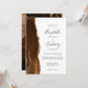 El borde izquierdo de esta elegante y moderna invitación a la boda incluye una pasarela de color marrón mocha bordeada por un falso purpurina de oro. El texto del personalizable combina la escritura a mano de carbón gris, el copperplate y las fuentes cursivas en un fondo blanco. El reverso presenta un diseño de agate color marrón mocha y dorado a juego.