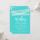 Esta elegante y sencilla invitación a las bodas es perfecta para un evento moderno de temática rural. Incluye luces de cuerda colgantes de frascos de masón brillantes en la parte superior de un fondo verde-azul verde azulado brillante con tipografía de escritura de pincel equivalente. Es elegante, bonito, minimalista y de moda, perfecto para su día especial. ***NOTA DE DISEÑO IMPORTANTE: Para cualquier solicitud de diseño personalizado, como solicitudes de productos coincidentes, cambios de color, cambios de posición o cualquier otra solicitud de cambio, haga clic en el botón "MENSAJE" o envíe un correo electrónico al diseñador directamente a lafemme.art@gmail.com. Incluso puede enviarle un correo electrónico solicitando un diseño completamente personalizado y nuevo.