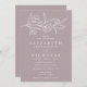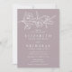 Elegantes invitaciones florales de bodas con flores blancas esbozadas y hojas cerca de la parte superior de la invitación con un polvoriento fondo morado. Personalice la invitación a la boda botánica con sus nombres y detalles bodas a continuación en letras blancas clásicas. Diseñado para coordinar con nuestra colección de bodas florales esbozados.