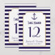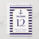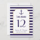 Tarjetas de número de mesa de boda náutica de la marina y ancla de franja blanca.