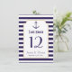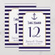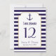 Tarjetas de número de mesa de boda náutica de marina y ancla de franja blanca.