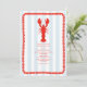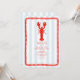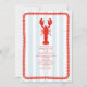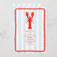 Ilustracion de la langosta sobre el texto rojo. Fondo de banda azul y borde de tablero de ajedrez rojo.