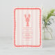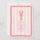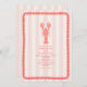Ilustracion rosa y rojo de langosta sobre texto rojo. Fondo de banda rosa y borde de tablero de ajedrez rojo.