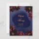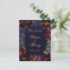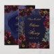 Una invitación de boda de color navy burgundy que presenta una sinfonía de peonías rojas bordeaux profundas adornadas con spray dorado y contornos dorados brillantes que se reúnen alrededor de un fondo de lavado de acuarela azul navy con sus nombres grandes en letra rústica dorada con una fuente sans serif mayúscula que anuncia sus detalles.