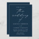 Minimalista y moderna invitación a la boda con los detalles de su boda en letras simples y blancas con "el boda de" en un elegante guión de caligrafía. El fondo marino puede cambiarse a un color de su elección. Diseñado para coordinar con nuestra colección de bodas Modern Elegance.
