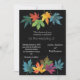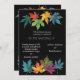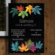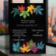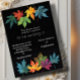 El diseño de esta tarjeta boda presenta una sorprendente disposición de hojas de otoño coloridas, representadas en un estilo minimalista contra un fondo negro sólido. Las hojas, en tonos verdes, naranjas, amarillos, azules y púrpura, están repartidas artísticamente en dos grupos (uno en la parte superior y otro en la parte inferior de la tarjeta), creando un marco natural para el texto. Los colores vivos de las hojas le dan un toque alegre y festivo a la carta, mientras que el fondo negro le da un toque elegante y moderno. Este diseño es perfecto para un boda con temática de otoño, que combina la belleza de la naturaleza con elementos de diseño contemporáneo. Personalice la tarjeta con sus nombres y detalles del boda. Puedes descargar la tarjeta en tu equipo móvil o computadora. Tarjeta creada con ayuda de ai.