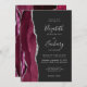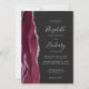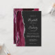 El borde izquierdo de esta elegante y moderna invitación a la boda incluye una acuarela de color burdeos bordeada por un falso purpurina de plata. El texto del personalizable combina la escritura a mano gris plateado, el copperplate y las fuentes cursivas en un fondo fuera de negro. El reverso presenta un diseño de ágata de color burdeos y plata a juego.