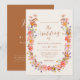Invitación de boda boho floral de otoño con corona de flores silvestres pintada a mano con acuarela y elegante letra