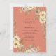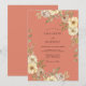 Un fondo terroso de óxido establece un tono cálido para este diseño floral, mostrando delicadas rosas crema y anémonas suaves amarillas. Hojas de acuarela pintadas a mano en verde salvia están dispuestas para crear un efecto botánico exuberante. La combinación de ricos tonos otoñales y elementos florales silenciados proporciona una estética sofisticada y pastoral.