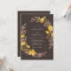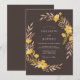 Un fondo profundo de espresso establece un tono sofisticado para este diseño botánico terroso. Flores silvestres y botones de oro pintados a mano en tonos de bronce y amarillo dorado crean un borde cálido y natural de follaje y pétalos. Esta estética captura la esencia de una atmósfera de cosecha sombría, perfecta para un tema rústico de bosque.