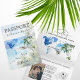 Moderno y elegante Destino Boda de Invitación al Mapa Mundial, como pasaporte. Playa con palmeras tropicales, ilustracion acuático
