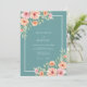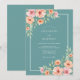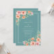 Delicadas flores de acuarela en tonos de melocotón y rosa bailan sobre un fondo turquesa tranquilo. Un exuberante follaje se entrelaza con suaves racimos florales, creando una estética artística y romántica perfecta para una celebración memorable.