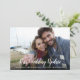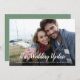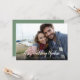 Anuncia tu boda pospuesta con esta tarjeta de foto moderna. Cuenta con un marco de foto horizontal que llena toda la parte frontal de la tarjeta. El diseño está acentuado con texto de estilo manuscrito que dice: Actualización de nuestra boda. La parte trasera es verde salvia con un patrón de puntos y ofrece texto personalizado para más detalles.