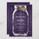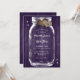Invitación a una boda rústica y personalizado de color púrpura con un frasco de albañil y dos corazones de arpillera sobre un fondo de madera púrpura.