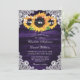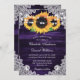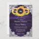 Invitación a una boda rústica con flores de sol y violeta en un marco rústico de madera adornado con encaje floral blanco y luces agitadas. Elementos coincidentes disponibles.