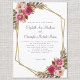 Chic Cassis, invitación de boda elegante y formal que presenta una romántica acuarela floral de boda exhibida con exuberante vegetación sobre un fondo blanco clásico crujiente. Un marco geométrico de cristal con forma de cristal de color dorado brillante proporciona un toque moderno. La redacción tradicional y clásica proporciona una elegancia atemporal. Personalice el diseño de la boda con sus detalles en elegante letra y caligrafía de color púrpura cassis. La parte posterior de la invitación es de color púrpura cassis sólido coincidente, completando el diseño.