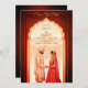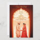 Anuncie su día especial con esta elegante y tradicional tarjeta de boda indio "Save the Date". El bonito diseño cuenta con un ilustracion pintado a mano de una pareja india majestuosa enmarcada por un impresionante arco tallado. Los ricos tonos tierra de marrón profundo y marrón crean un ambiente cálido y acogedor, mientras que los toques dorados aportan un toque de lujo. Esta plantilla de personalizable es perfecta para un boda hindú o sudasiático, con amplio espacio para personalizar los nombres, fecha y ubicación. Ideal para una "Save the Date" o una invitación digital, esta tarjeta captura maravillosamente la esencia de una historia de amor eterna.