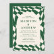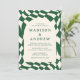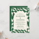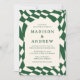 Invite a los huéspedes a celebrar su día especial con elegantes invitaciones de boda Retro Green Checkerboard! La invitación muestra sus nombres y detalles bodas con letras verdes rodeadas de un marco en arco de color crema. El fondo presenta un patrón abstracto de tablero de ajedrez con un esquema de color verde y crema.