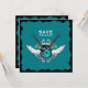 Anuncia tu boda con esta tarjeta de Save the Date poco convencional al estilo rock and roll con guitarras eléctricas de rock cruzadas, alas y ornamentos vintage sobre azul turquesa y negro.