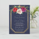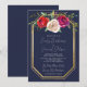 Una magnífica invitación a una boda floral con flores de color burdeos, rojo, ciruela y color crema rosa + un marco dorado contra un fondo azul marino. Por favor, contáctame si quieres ayudar a personalizar esta invitación a la boda.