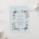 Este diseño evoca un ambiente sereno y romántico con su suave fondo azul celeste y una delicada disposición de elementos florales discretos. Representaciones elegantes de rosas y follaje plumoso en tonos de gris, taupe y marrón suave crean una estética atemporal y elegante. Perfecto para una ocasión sofisticada.