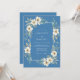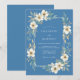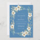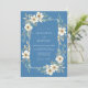 Un suave diseño de acuarela presenta delicadas flores de periwinkle y exuberante vegetación que rodean un diseño refinado. Esta disposición artística evoca un ambiente suave y romántico, perfecto para una ocasión especial. La paleta se centra en azules serenos y blancos cremosos con toques de oro apagado.