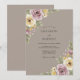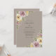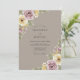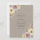 Este diseño presenta un fondo cálido taupe adornado con suaves flores de acuarela. Rosas malva románticas y flores amarillas de mantequilla crean una estética inspirada en el vintage. Delicado follaje verde salvia y pequeñas flores de acento púrpura se agrupan en las esquinas para un ambiente elegante y terrenal. La paleta es perfecta para un evento romántico sofisticado.