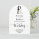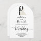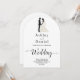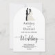 Esta elegante invitación a la boda en arco blanco y negro es perfecta para un boda moderno. El diseño es sencillo y cuenta con una elegante caligrafía negra y un ilustracion de novios sobre un fondo blanco y limpio. La tarjeta de invitación incluye los detalles del boda en la parte posterior en lugar de pagar por una tarjeta separada.