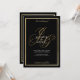 Un elegante monograma dorado a la moda ruega las elegantes invitaciones minimalistas de boda románticas en negro y oro.